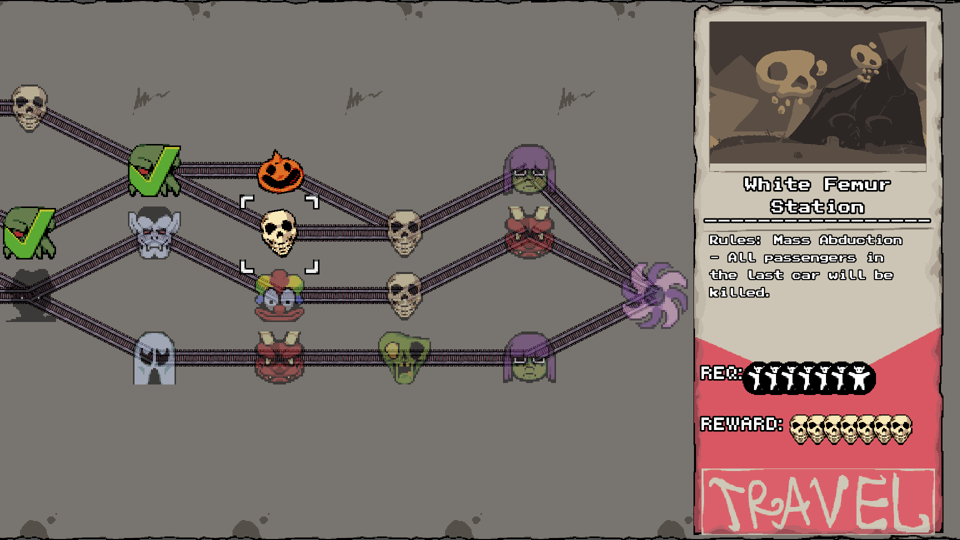 Chew Chew Train is a rogue-like management puzzle game where you must take care of spooky passengers that ride your train. Except your train also uses passenger as fuel! Will you be able to reach the mysterious End of the Line or will you be eaten by your own train first? There's only one way to find out!